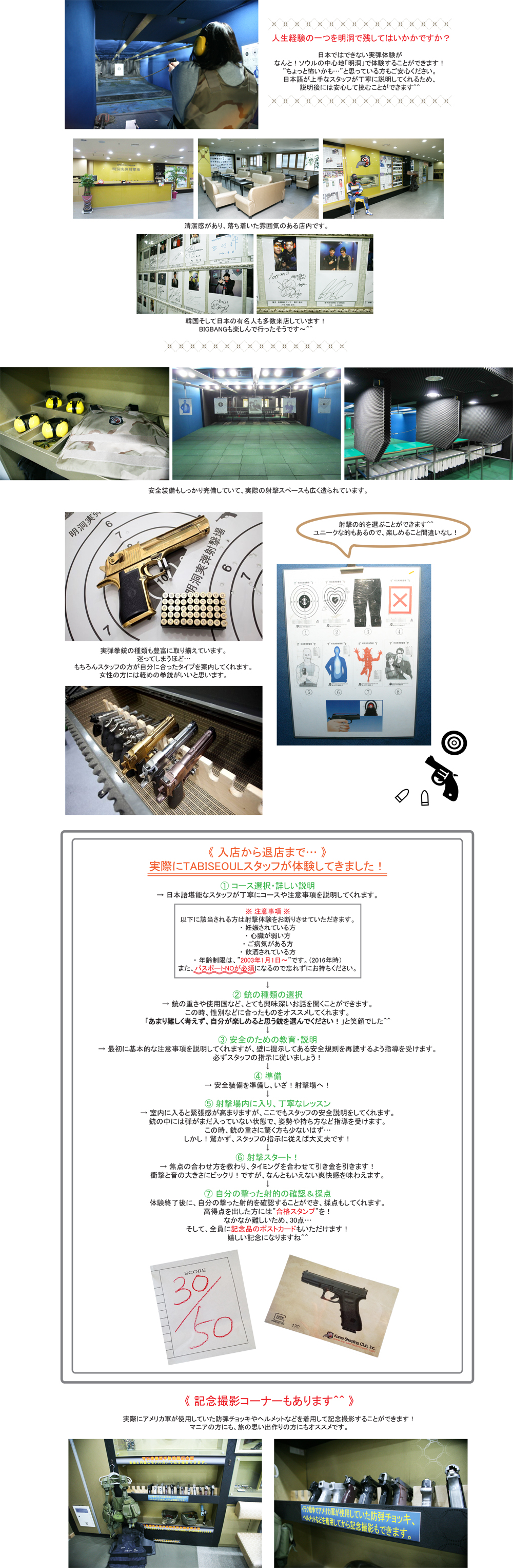 【プレゼント】2銃弾 銃弾数を無料で追加! ・1セット(10発)時→銃弾2発サービス ※40,000ウォン、50,000ウォン60,000ウォンの3つのタイプがあり、実弾の大きさによって金額が異なります。 ・2セット(25発)時(80,000ウォン~)銃3挺:他のピストルで銃弾5発サービス ・3セット(40発)時(120,000ウォン~)銃4挺:他のピストルで銃弾10発+記念写真サービス (こちらをスタッフにお見せください) 총탄 서비스 ・1 세트(10발):총탄2발 40,000원 50,000원 60,000원 세가지 타입이 있으며 실탄 크기에 따라 금액이 다르게 됩니다 ・2 세트(25발)(80,000~) 총기 3정:다른 총으로 총탄5발 ・3 세트(40발)(120,000~) 총기 4정:다른 총으로 총탄10발+기념사진 서비스